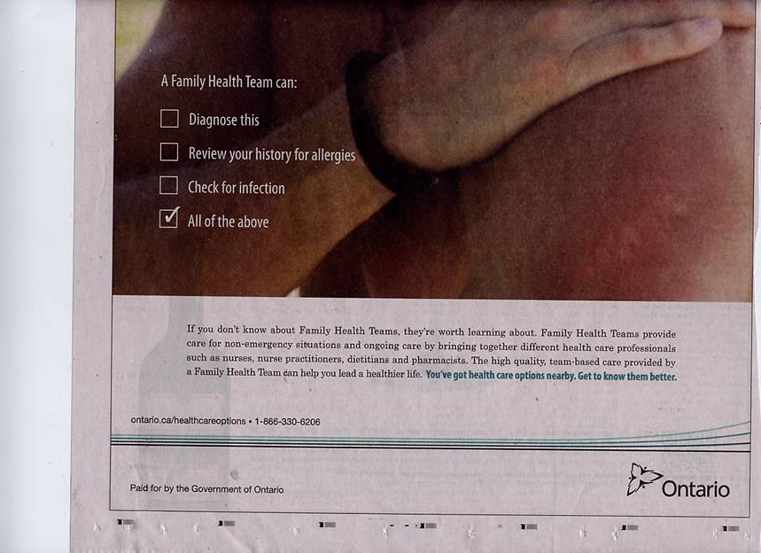 As mentioned in the 2010-11-09 Members Only update, “Health Care Options” ads are now running on TV and radio, following up from Premier’s Nov.1 announcement. The ministry has launched a public education campaign to raise awareness of the many health care options available to Ontarians. Their research has shown there are low levels of awareness of new models of care, so the objective is to increase the level of knowledge and understanding of what Family Health Teams, Nurse Practitioner led Clinics, Urgent Care Centres etc. do. The ministry feels it is getting good results so far, with over 3,000 visits a day to the health care options website. The Health Care Options campaign consists of television, newspaper and online advertising. The television advertising will run until early January and the online advertising will appear until the end of March. The call to action in all of the advertising is to visit the Health Care Options website for more information. The website includes short videos and explanations of each of the health care options. A half-page ad appeared Saturday morning (November 20, 2010) on page A22 of the Globe and Mail. In the ministry’s words: We chose to profile Family Health Teams in a very deliberate manner because our quantitative and qualitative research showed very low levels of awareness of this model of primary care amongst Ontarians; this includes people who are enrolled in Family Health Teams. We felt that it was important to educate people about this and other new models of care so that they could get a sense of how the overall health care system is changing to meet people’s needs in the future. A number of AFHTO members noticed that, while the ad drew attention to the different health care professionals brought together in FHTs, doctors were omitted from the list. The ministry assured AFHTO this was an oversight that is being fixed for future ad insertions which will appear in community newspapers. The ministry also welcomed AFHTO’s offer to provide feedback on future advertising about FHTs.