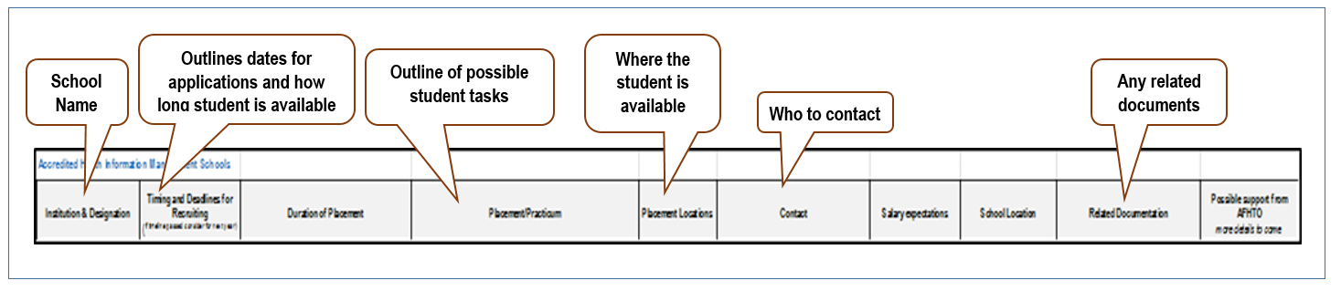 This spreadsheet contains details on timelines for posting job descriptions, interviewing, placement time and duration, type of activities sought by the institution, and salary expectations. Please note that for some of the institutions there is no salary expectation, but AFHTO encourages some kind of remuneration be paid to the student in recognition of their contribution. If the schools rules forbid paying the student for the placement, a Thank You gift or a stipend at the end of the term of employment would be appropriate. Links to further program details and any relevant forms or documents are also within the spreadsheet. Explanation of Spreadsheet